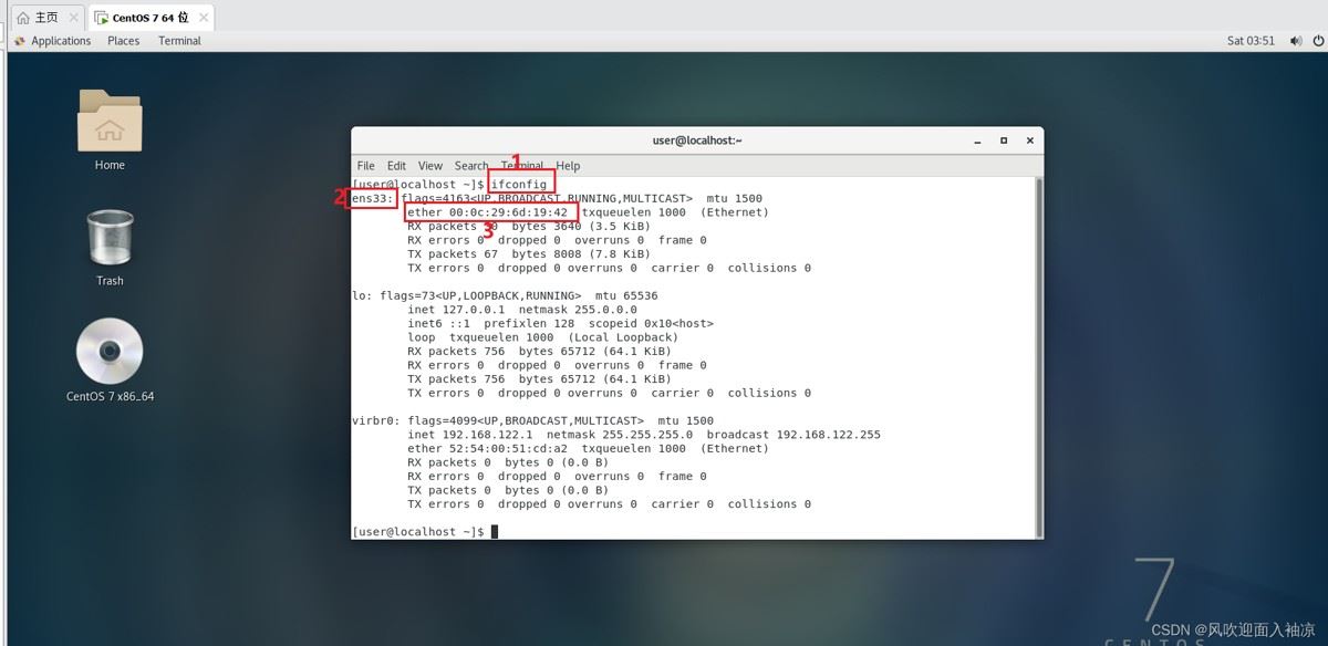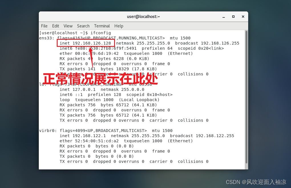 按照正常情况来说,当我们输入ifconfig后会在下图序号为3的地方出现我们的ip,但是这边并没有出现。