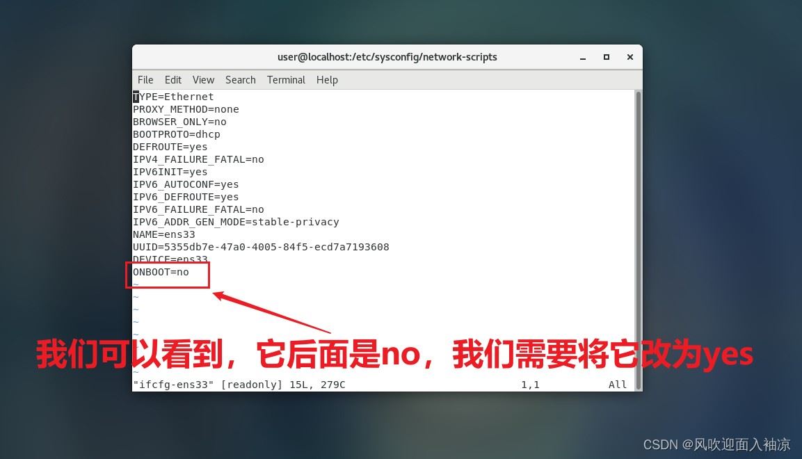 使用命令 vi ifcfg-ens33 编辑此文件,打开文件你会发现这里ONBOOT=NO