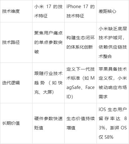 小米 17 在硬件参数上实现了对 iPhone 17 的局部超越,但在芯片自研、系统架构、算法积淀等核心技术领域仍存在 2-3 年的代差。这种差距并非 “参数堆砌” 能弥补,而是苹果数十年技术体系化建设的必然结果。小米要真正实现技术对等,需从 “供应链整合者” 转向 “底层规则制定者”。