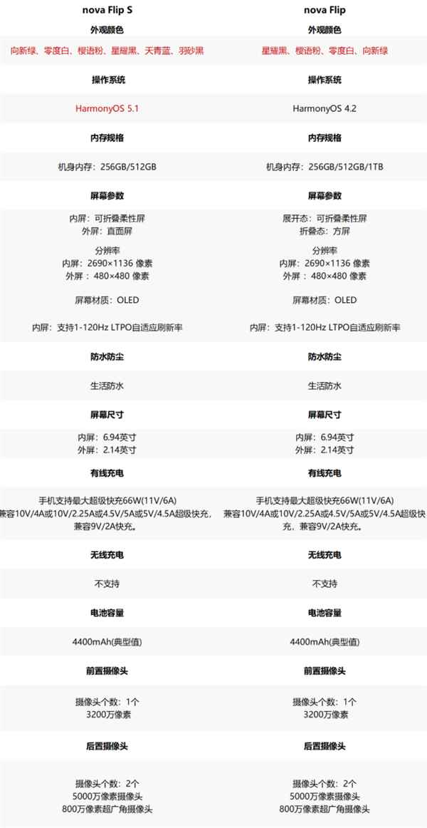 根据华为客服提供的nova Flip S、nova Flip重点参数对比,nova Flip S新增天青蓝、羽砂黑两款配色,出厂预装鸿蒙OS 5.1操作系统,其他规格基本与nova Flip一致。