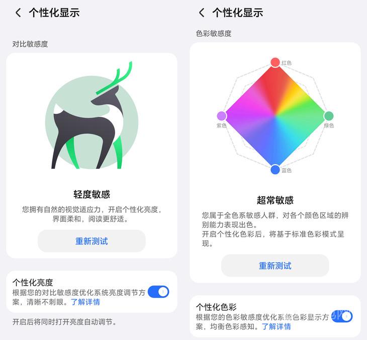 荣耀Magic8还引入了个性化显示功能,这一功能正是针对不同用户面对同一块屏幕,观感与疲劳度差异巨大的问题。其实是因为每个人的视觉特征——包括对亮度、色彩的感知能力——都因视网膜中视杆与视锥细胞的差异而独一无二。而荣耀借助设备级多维视觉特征检测,通过前置传感器与AI算法,在无需外接设备的情况下,即可完成一套媲美专业仪器的视觉特征分析,精准定位您的视觉敏感度。