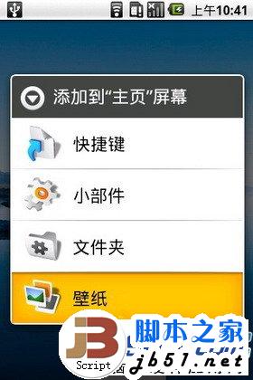 1.请先手指长触屏幕,此时画面将会弹出“添加到主页屏幕”窗口,点击其中的“壁纸”。在出现的下拉窗口中,“壁纸”是手机内置的一些壁纸,“图片”里你可以设置你SD卡里的图片或者已拍摄的照片做为壁纸。