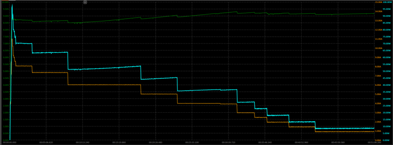3分10秒后再次降流到63W,之后持续5分钟直到8分10秒降低到50W。