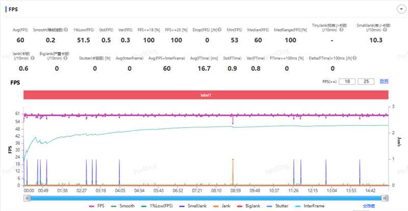 压力最大的崩铁还是略有困难,最高画质60帧,普通模式,可以达到59.4FPS的平均帧,稳帧指数1.6,1%low28.3FPS,有几段比较持续性的掉帧,小波动也不少。
