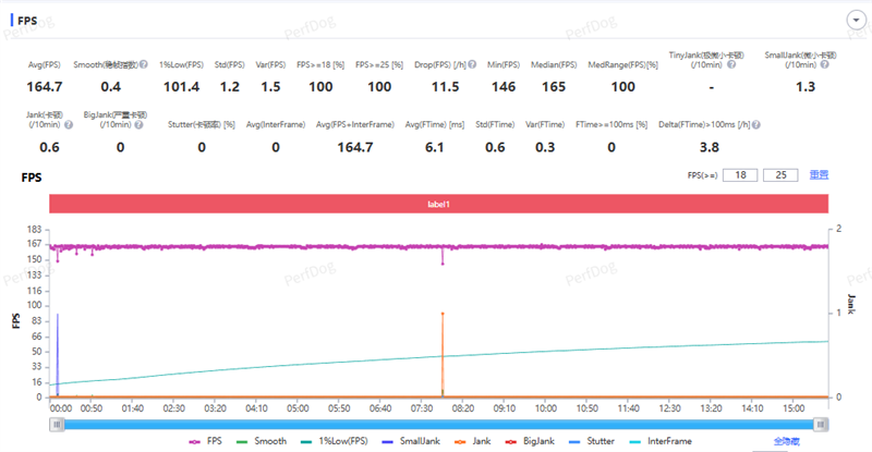 在一局搜打撤中,平均帧数为164.7FPS,稳帧指数0.4,1%low帧101.4。