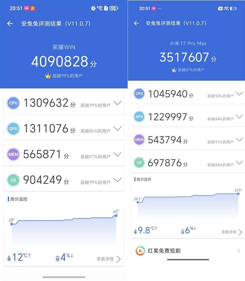 28度室温下,荣耀WIN依然有409万分,比起20度时仅仅低了1.5万。而另外一款手机跑分351万,比20度时低了14万。
