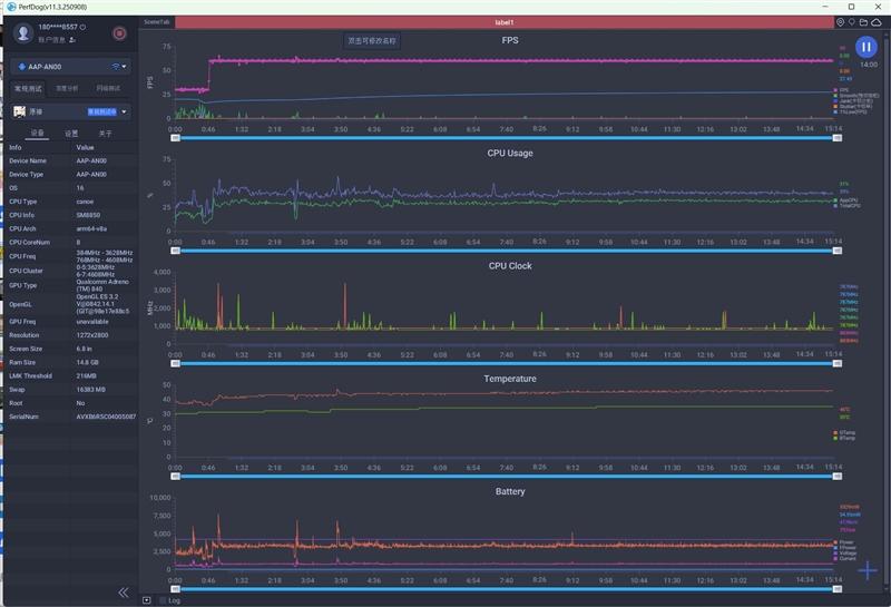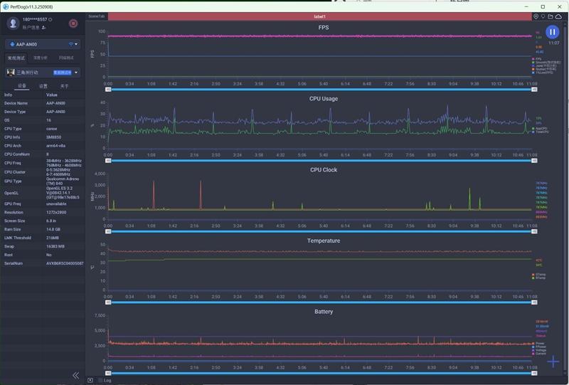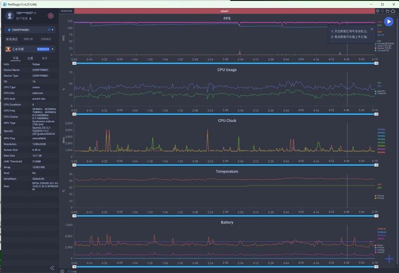 另外一款骁龙8 Elite Gen5手机,帧率也是60FPS,SOC温度57度,功耗4400mW。