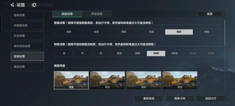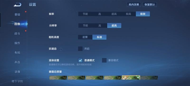图像质量选择“极高”,同时将帧率上限调为60FPS。