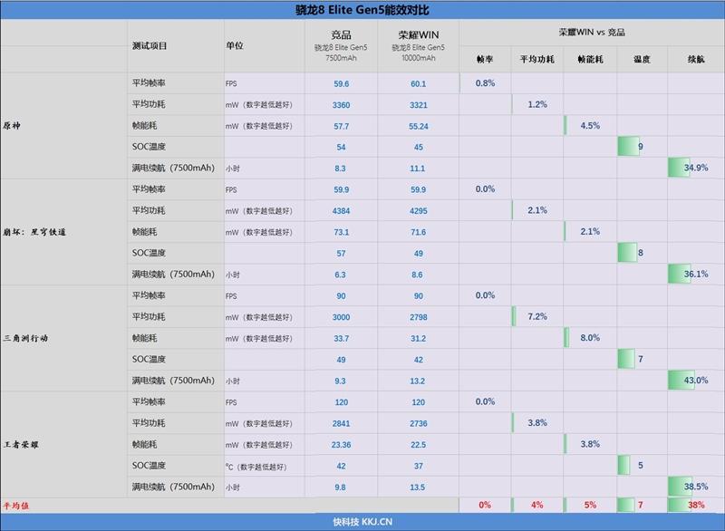 在4款游戏中,荣耀WIN的平均温度比另一款骁龙8 Elite Gen5手机低了7度,相差最高的是《原神》,低了9度,相差最少的《王者荣耀》也有5度。