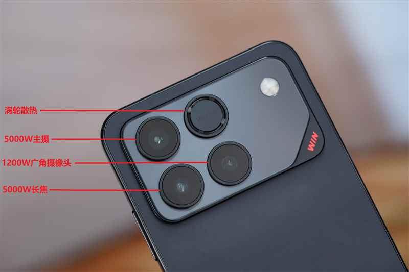 后置三个摄像头和一个荣耀东风涡轮散热系统。