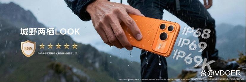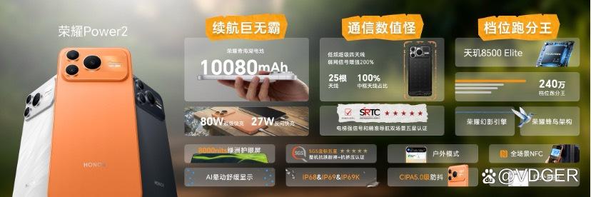 户外用,可靠性太重要了。荣耀 Power2 的机身中框用了四角榫卯卸力设计,抗摔提升 25%,抗弯提升 22%,还过了 SGS 金标五星抗跌耐摔 + 抗挤压认证,不小心掉地上也不用心疼。防水防尘更是拉满,IP68+IP69+IP69K 三重认证,不管是下雨、泡水,还是高温环境,甚至 10000 + 次反复入水都没问题,登山、露营、海边玩都能放心带。