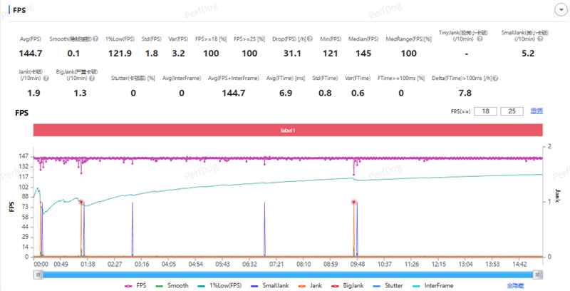在极致画质144帧的画面设置下,一局游戏的表现极佳,平均游戏帧数为144.7FPS,稳帧指数0.1,1%low帧也有121.9FPS。整局游戏帧数波动平稳,体感掉帧几乎不存在。