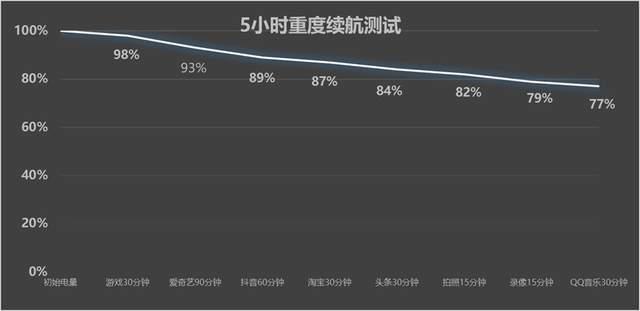 续航配置方面,iQOO 15 Ultra采用了7400mAh蓝海大电池+100W超快闪充+40W无线闪充组合,在当前的旗舰市场也属于领先水准。我们对该机进行ZOL五小时重度续航测试,测试环境为室温环境下,连接办公室Wi-Fi,关闭蓝牙、GPS,屏幕亮度、音量均设为50%,结果如下:
