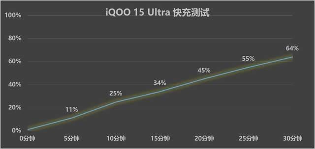在将电量耗尽后,我们也对iQOO 15Ultra的100W快充进行测试。在设置中开启默认超快充电后,该机可在30分钟内为手机补充64%电量,可以满足用户日常中快速回血的需求。