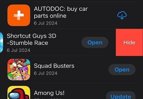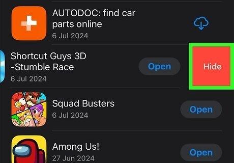 5. 点击红色的隐藏按钮。这将从已购买或已下载的应用列表中移除该应用。您可以对列表中的其他任何应用重复这些步骤。