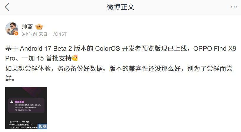 一加社区负责人 @帅蓝 今日在微博发文宣布,基于 Android 17 Beta 2 版本的 ColorOS 开发者预览版现已上线,OPPO Find X9 Pro、一加 15 首批支持。