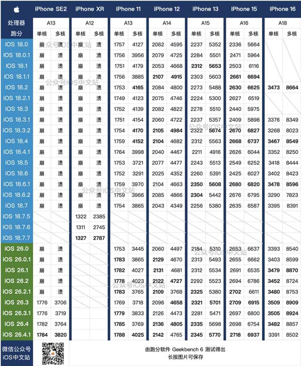 在本次测试中,iPhone XR 升级到 iOS 18.7.7,其它 6 款升级到 iOS 26.4.1