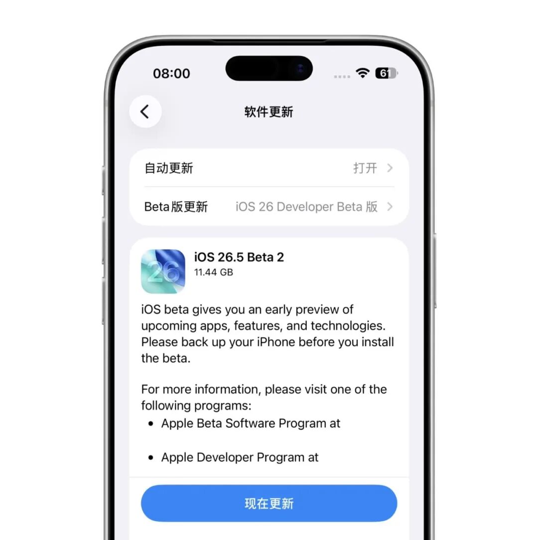 我们主要看看更多 iPhone 用户比较关心的 iOS 26.5 Beta 2,这个版本其实并没有带来可见新功能。