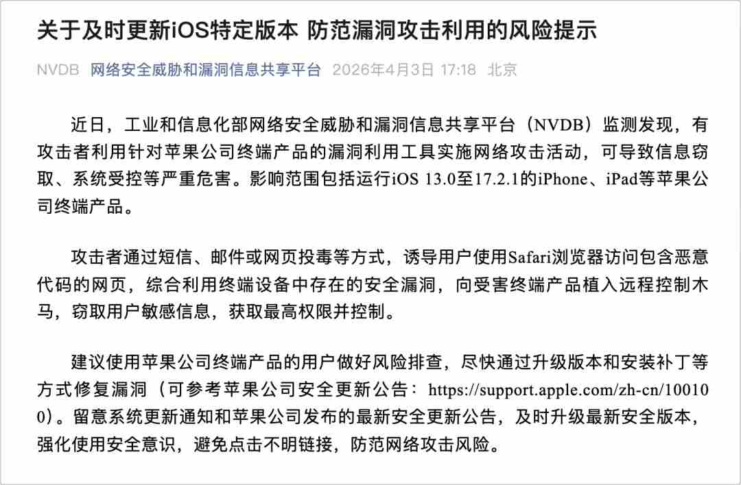 Apple官方特地发布了一篇安全提醒文章,建议部分机型尽快升级到新系统版本。