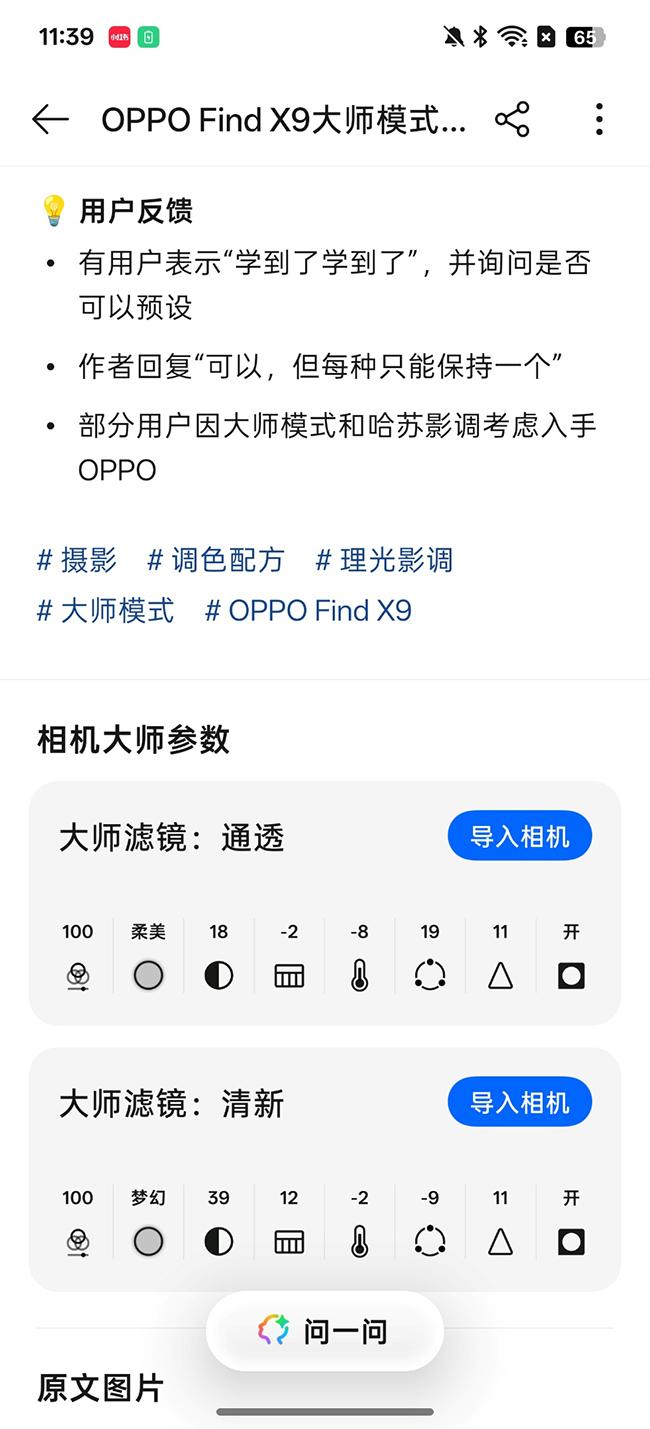 如果预设风格仍不足以满足个性化表达,用户还可在大师模式中自由调节影调、饱和度、色温、锐度以及暗角强度等参数,手动构建专属的色彩配方。更便利的是,当在社交平台看到心仪的他人风格时,借助AI一键闪记大师参数导入功能,无需对照截图逐项调试,即可将完整参数同步至相机设置。