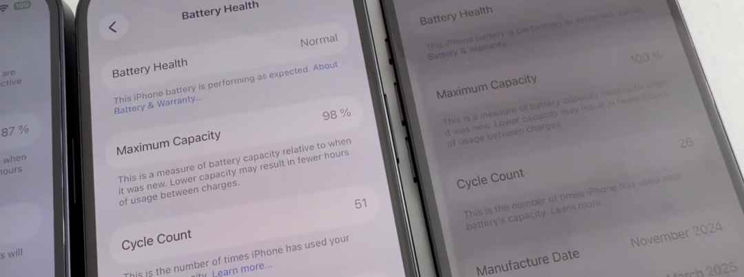 测试时检查这7台手机的电池健康度分别为:84、89、87、87、87、98、100