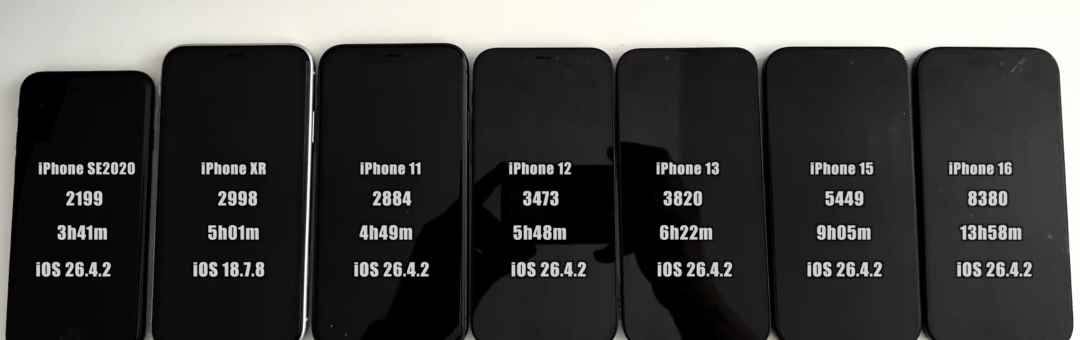 上周,苹果发布了 iOS 26.4.2 正式版,修复了“幽灵通知”的bug,那么续航怎样呢?外网博主 iAppleBytes 带来了对比实测。