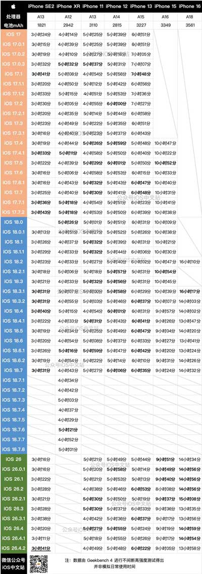 上方是iOS17、 iOS18所有版本、到目前 iOS26 的续航实测时间,大家自行对比。注意:要考虑电池健康度逐渐下降的问题,所以对比相近的版本比较合理