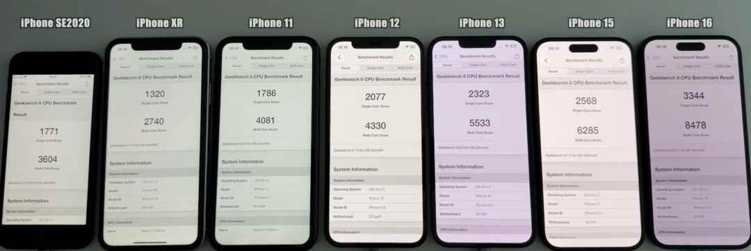 本次测试一共使用 7 款 iPhone,分别为 iPhone SE2 / XR / 11 / 12 / 13 / 15 / 16,包含了 A12 ~ A18 的芯片