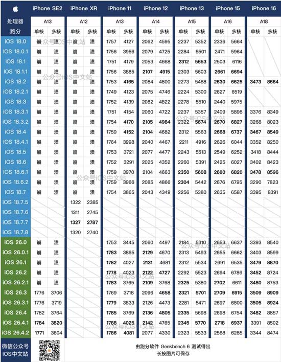 在本次测试中,iPhone XR 升级到 iOS 18.7.8,其它 6 款升级到 iOS 26.4.2