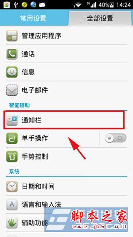 1)打开华为荣耀3c手机,点击“设置”后点击“全部设置”,然后找到并点击“通知栏”,再点击“自定义快捷开关”。(如下图所示)