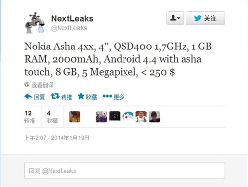 此前,我们已经看到了传闻中搭载安卓系统的诺基亚手机的谍照。而现在,曾经曝光了诺基亚Lumia1820和Lumia1525新机信息的推特用户NextLeaks又提前为我们揭晓了该机的价格。按照他的说法,诺基亚Normandy的正式型号将是Asha 4xx,而手机的售价则达到了185欧元,约合人民币1500元左右。