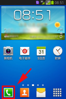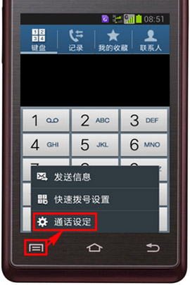 1)打开三星W789手机的通话键,进入拨号界面后点击左下角的菜单,选择“通话设定”。(如下图所示)