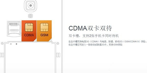 红米1S电信版采用双卡槽设计,支持2张手机卡同时待机,左边卡槽支持电信3G(CDMA)与电信、联通、移动2G(GSM/CDMA1X)网络,右边卡槽还可放入一张移动或联通2G卡,支持GSM网络。