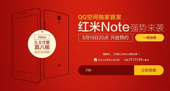 红米Note智能手机QQ空间预约地址为:http://xiaomi.qzone.qq.com/