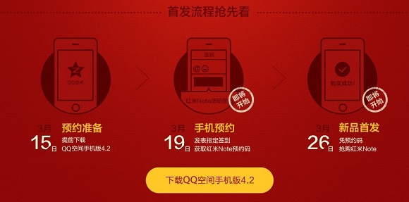 预约方式 : 用户通过QQ空间手机版4.2成功发表指定活动签到后,即可获得红米Note购买预约码,用户可凭预约码参与抢购红米Note。