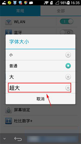 2)在“字体大小”里面点击“超大”按键,这样华为荣耀畅玩版的字体就跳到最大了!(如下图所示)