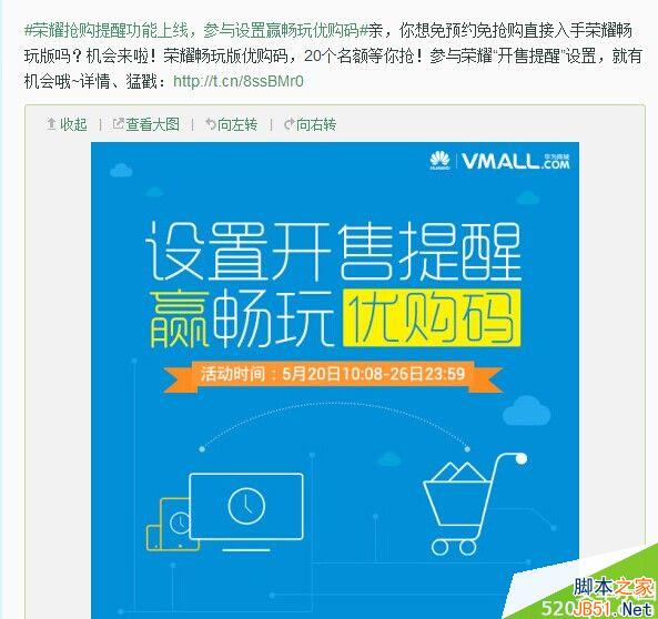 5月22日晚上20整,荣耀家族,昨夜一起荣耀开售!荣耀畅玩版,至美好,真八核,仅售998元,届时更有荣耀3C、荣耀3X、荣耀X1三伙伴同期开放购买。你想免预约免抢购直接入手荣耀畅玩版吗?机会来啦!荣耀畅玩版优购码,20个名额等你抢!那么华为荣耀畅玩版优购码怎么获得呢?小编就来告诉你吧!