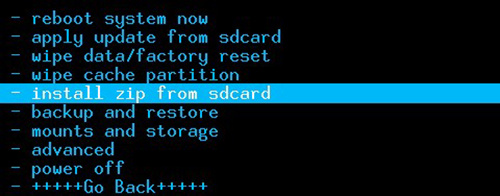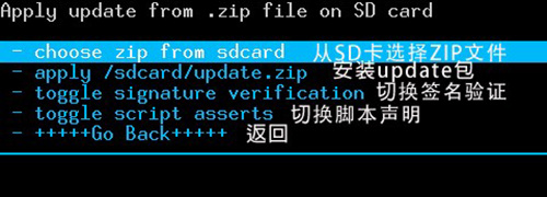 3)接下来就是开始刷入zip格式的刷机包了,按音量键选择install zip from sdcard确认,然后再按音量键选择choose zip from sdcard,然后确认,接下来按音量键移动光标找到之前放入SD卡根目录的刷机包,然后选择Yes – Install XXXXX.p-确认开始刷机。