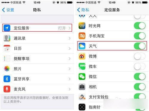 第二步:进入之后我们要选择“定位服务”选项,之后向下滑动菜单,找到“天气”选项并开启该功能。