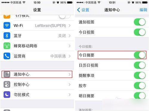第三步:接下来我们要退回“设置”选项页面,然后点击“通知中心”,打开“今日摘要”选项。