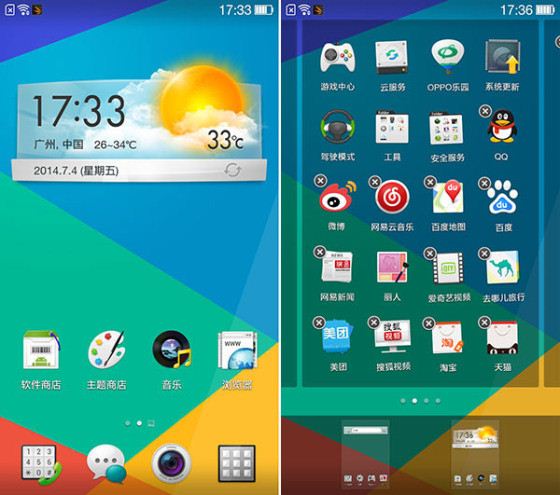 与时下扁平化设计的大趋势不同,Color OS走的依然是一条拟物化风格的路线。从天气插件到默认图标,我们都能够感觉到我们十分熟悉的物理元素,这对于不熟悉智能手机操作的人来说,可以明显地降 低学习成本。就这一点来讲,OPPO的易用性是做得极好的。并且Color OS1.4版依然保留了安卓传统的二级菜单,仅在桌面留少量图标,其余则通过菜单按钮进入二级菜单选择。