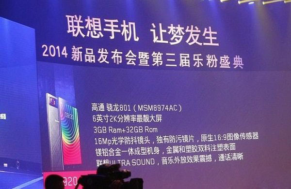 我我们来看看官方给出的关于联想K920的详细配置,联想K920搭载了高通骁龙801处理器,内建2.5GHz主频四核心以及Adreno 330图形处理芯片,并配以3GB运行内存以及32GB机身存储,标配4000mAh超大电池;采用6英寸2K屏,分辨率为2560*1440,像素密度达491ppi,亮度630尼特;配有后置1600万像素主摄像头+前置500万像素摄像头。联想K920支持4G网络,包括TD-LTE以及LTE FDD双4G模式,并支持双卡双待。
