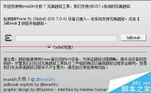 2.首先使用iTunes将设备恢复到iOS7.0.4,重新使用英文版Evasi0n7进行越狱。