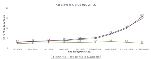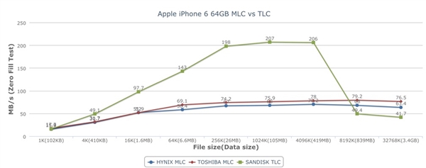 Kbench 针对 MLC 和 TLC 版本 iPhone 6 64GB 机型进行闪存性能写入测试,分别采用了 Zero Fill(全 0 模式)及 Random Fill(100% 随机模式)拷贝资料,进行 1K、2K 逐级递增至 32768K 等不同规格的大小测试,每个文件大小重复 100 次,测试结果令人震惊。
