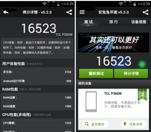 如图所示,通过测试,TCL P360W安兔兔跑分16523分,从跑分上看,与多数不足千元的四核手机跑分差距不大,可以流畅运行大多数游戏以及主流应用,只是512M内存,无法保证同时运行多个应用或者游戏不卡,总的来说,内存偏小是不足,其他性能表现尚可,对于一款不足500元,做工扎实的手机而言,还是比较值得推荐的。