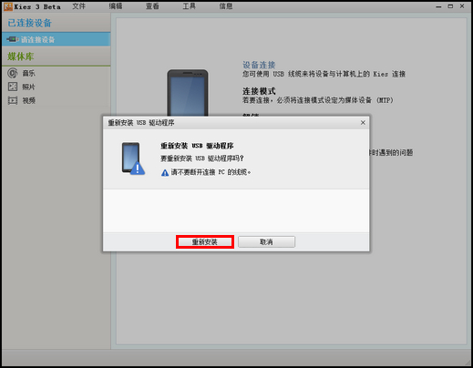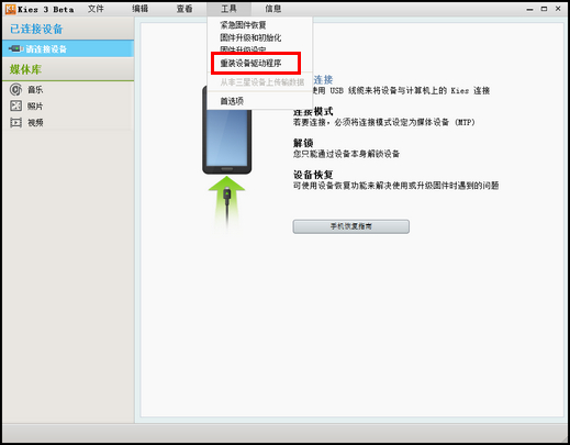 4、若不显示手机型号,请先断开手机与电脑的连接,然后点击Kies软件中的【工具】–【重装设备驱动程序】,如下图;