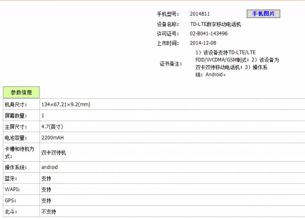 根据工信部最新公布的消息,型号为“2014811”的小米新机获得国内的入网许可,根据证书备注和参数消息极有可能为红米1S联通4G版本,在参数信息一栏中显示该机尺寸为134×67.21×9.2(mm),比现有红米1S 4G版(137×69×9.9mm)小了一圈,电池容量同样为2200mAh,屏幕同样为4.7英寸。