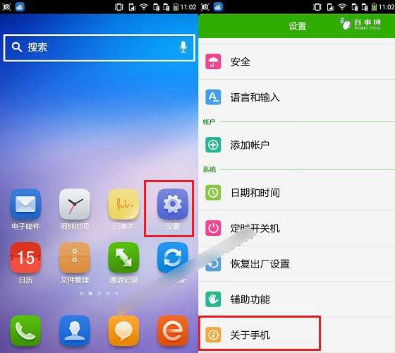 一、进入大神F1 Plus桌面界面,然后点击【设置】,进入设置之后,再点击进入【关于手机】,如下图所示。