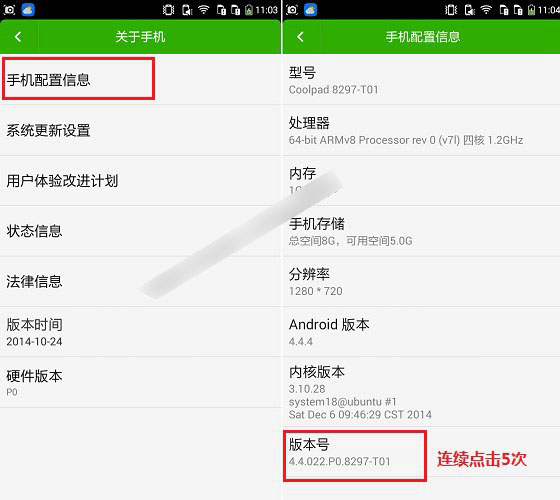 二、进入关于手机设置界面后,再点击进入第一项的【手机配置信息】选项,然后再连续快速点击底部的【版本号】3-5次,看到有提示已开启开发者选项即可,如下图所示。