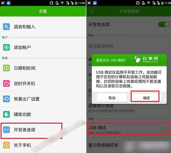 三、最后再返回“关于手机”设置,然后就可以看到【开发者选项】设置了,点击进入就可以找到【USB调试】选项,点击开启即可,之后会弹出一个“是否允许USB调试”提示框,点击【确定】即可,如下图所示。